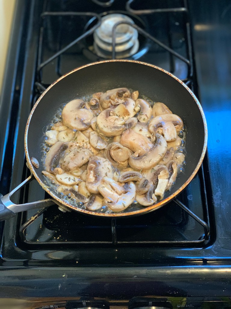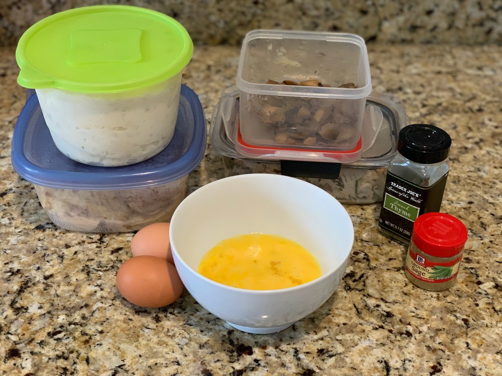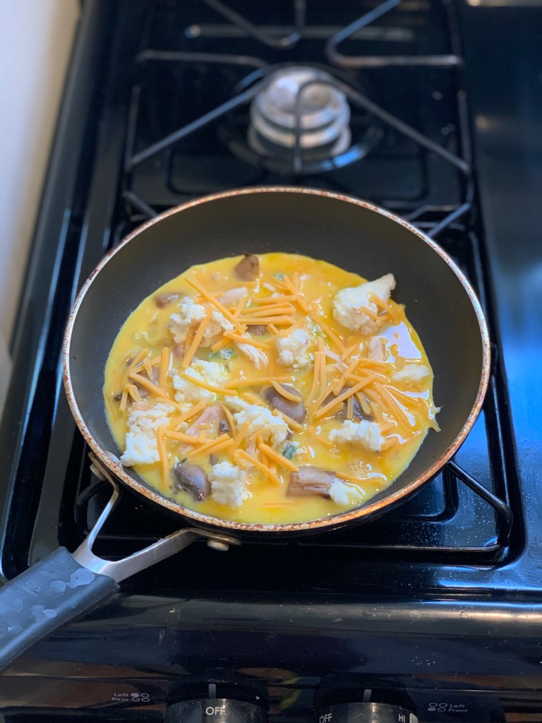 As I surveyed the available Turkey Day leftovers before making this, I noticed I had some unused raw mushrooms. I sautéed them in a little white cooking wine with dried sage and thyme for about 5 minutes on medium heat. They were delightfully flavorful and ready to be paired with the rest of the leftovers. I set the mushrooms aside and cooked the omelet in the same small frying pan to soak up the rest of that flavor.