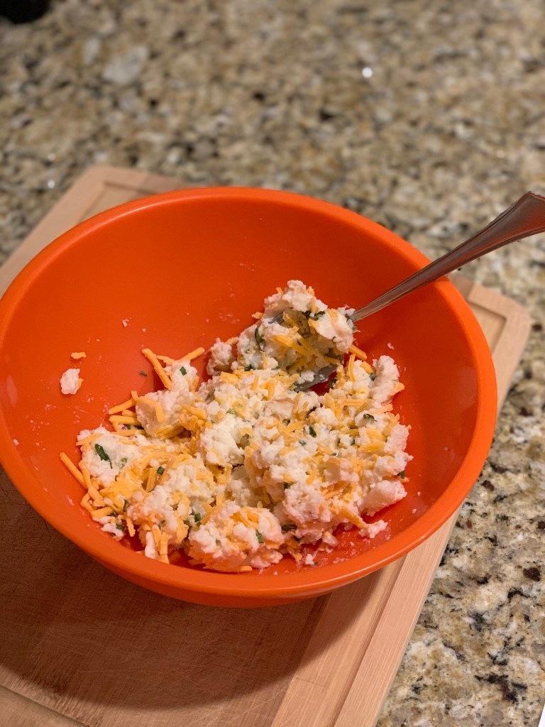 Step 1: Mix the following in a medium bowl: 1 cup cold leftover mashed potatoes, 1/2 cup shredded cheese, 1 teaspoon dried chives (double everything if you want more).