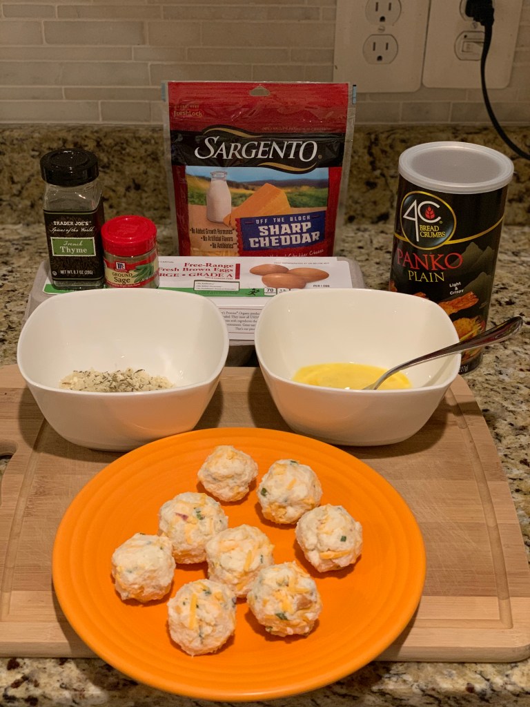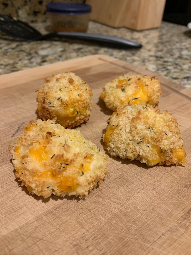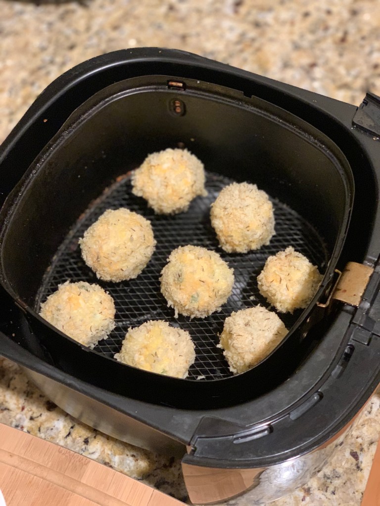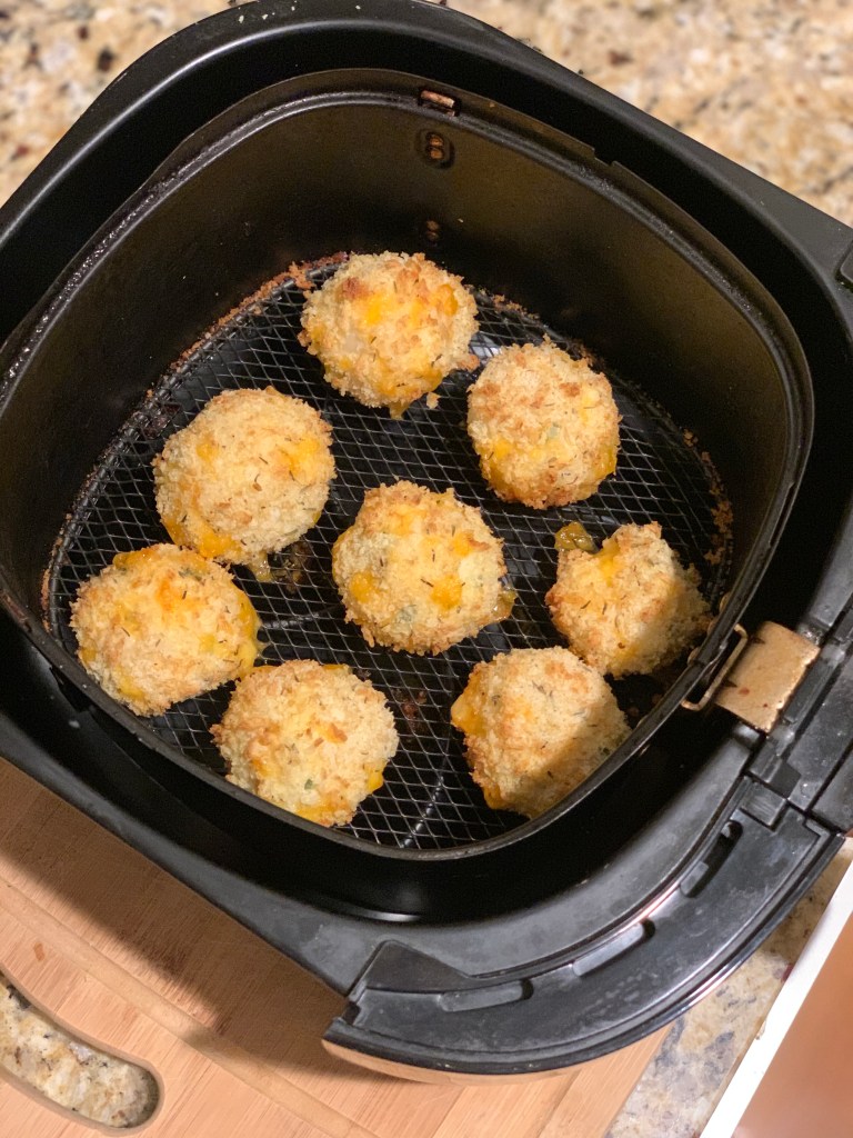 I wanted to keep these bites simple, so I used leftover mashed potatoes, shredded cheddar, and dried chives on the inside. The breading was a mix of panko breadcrumbs, dried thyme, dried sage, salt, and pepper. Those spices created a delicious fall flavor, but you can season the breadcrumbs however you like. Cooking these bites in the air fryer ensured they were lighter and healthier than pan or deep frying – I didn’t use a drop of oil in this recipe (though a quick oil mist would crisp these up even more).