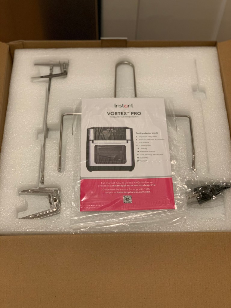 Speaking of accessories, let’s check out what the Vortex Pro comes with. I LOVE ACCESSORIES. As you can see in the picture above, the rotisserie spit is the first thing you see when you unbox. It also comes with a handy rotisserie lift to help you safely take your food in and out of the air fryer (this can be used with the rotating basket, as well).