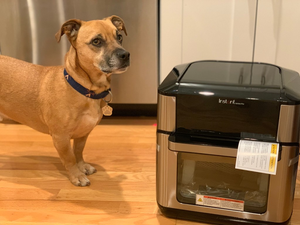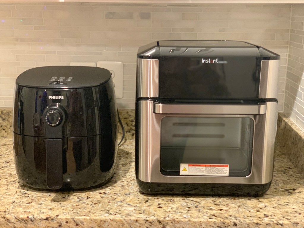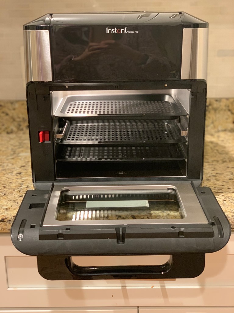 Right: The Instant Vortex Pro. This is on the smaller end of the toaster oven style spectrum of air fryers – perfect for those with limited counter space who still want more space for food.