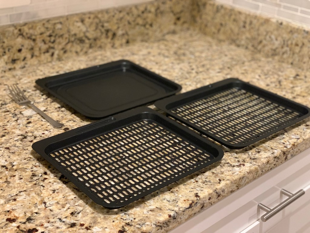 The Vortex comes with three trays – a drip tray (to be placed at the bottom to catch grease) and two non-stick cooking pans. They have holes in them so that the air circulates evenly as your food is cooking. All three pans are the same size – there is a fork next to the drip pan for scale.