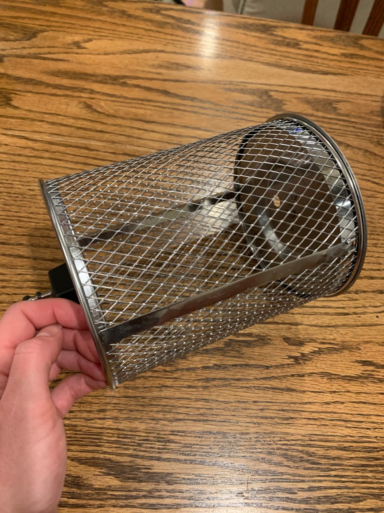 - In addition to the rotisserie spit, it also comes with a rotating basket that you can insert in lieu of the shelves. I imagine this being perfect for cooking things like french fries, where you’d want to shake/or flip often.