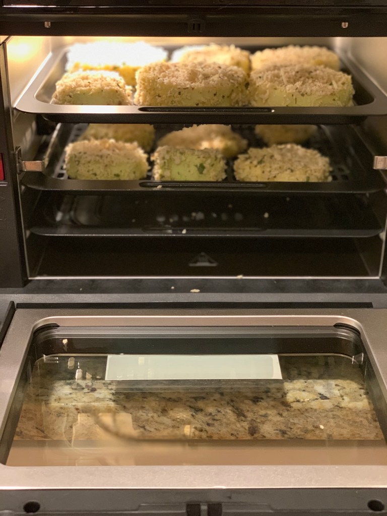 I air fried the eggplant for 8 minutes at 360 degrees. The Vortex does take a few minutes to preheat before the cooking time starts counting down. It also alerts you halfway through cooking time so you can rotate your food. I switched the top and bottom trays, and I could see that the top tray was browning MUCH faster than the bottom.