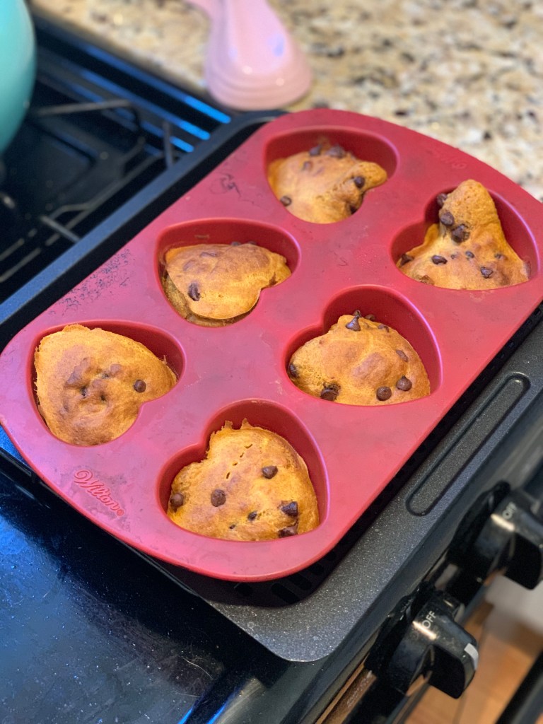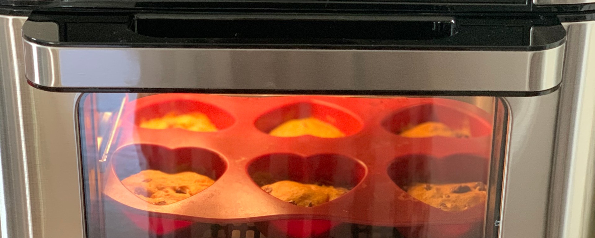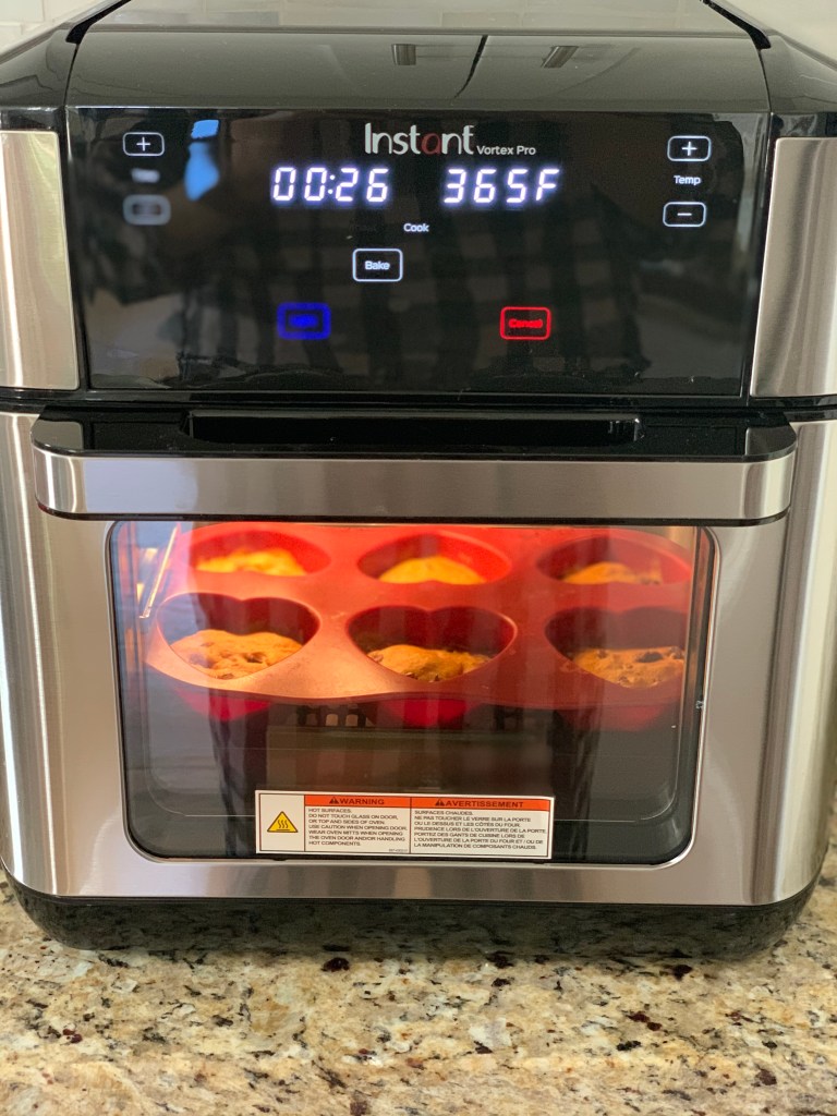 I settled on the heart-shaped silicone muffin molds that I rarely use (even though they are adorbs). They barely fit on the cooking tray – in fact, it was a bit of a squeeze. I filled each mold about 3/4 of the way full with pancake batter and sprinkled in some chocolate chips. I used the “bake” feature, which heated the Vortex up to 360 degrees automatically. I cooked the pancake muffin hearts for about 5 minutes, then pulled them out to test. They looked golden and brown on the outside, but parts were still gooey on the inside. I lowered the temperature to 350 and stuck them in the Vortex for 5 more minutes. BOOM. Hello, perfectly moist pancake muffin hearts. Admittedly, the bottoms stuck a bit to the molds, but a little butter or cooking spray next time would fix that.