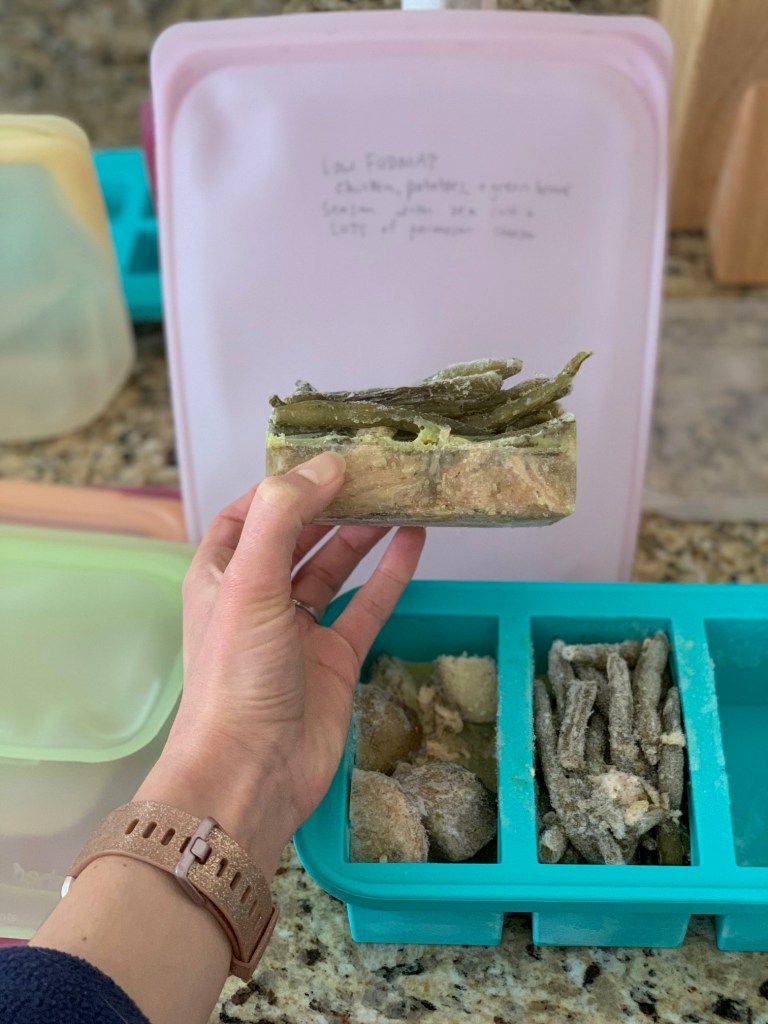 Once everything is frozen, you can pop things out of the cubes and store in Stasher bags! Don’t forget to label your Souper Cube lids and Stasher Bags (I like using non-toxic liquid chalk markers) so that you remember what everything is and how long it’s been in the freezer.